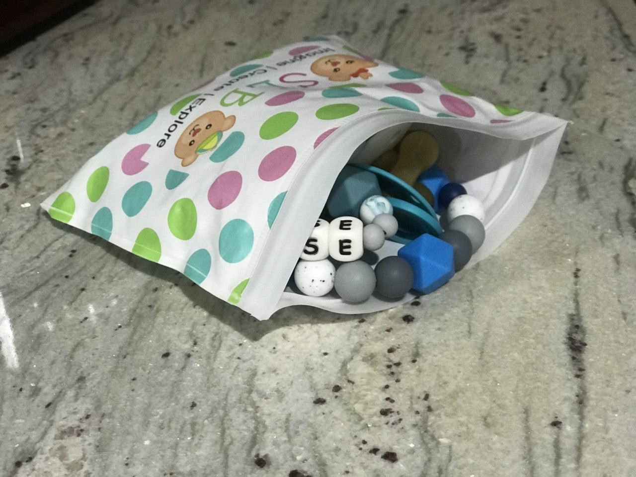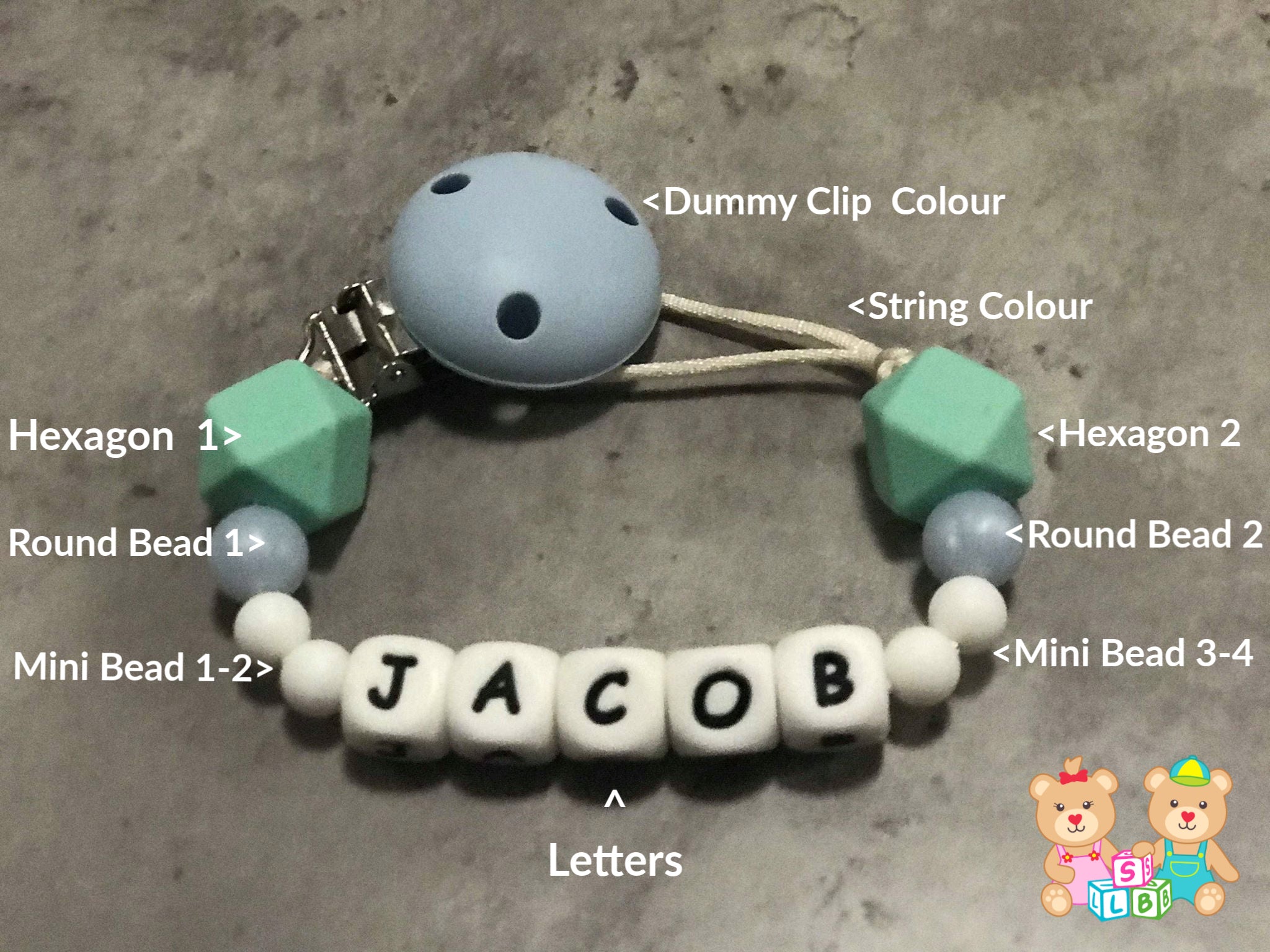 Please note our dummy chains are NOT toys or teething products. Therefore, a responsible adult must always always supervise the baby/child whilst using the dummy chain. SLB’S dummy chains are made from silicone beads, which are BPA & toxin free.