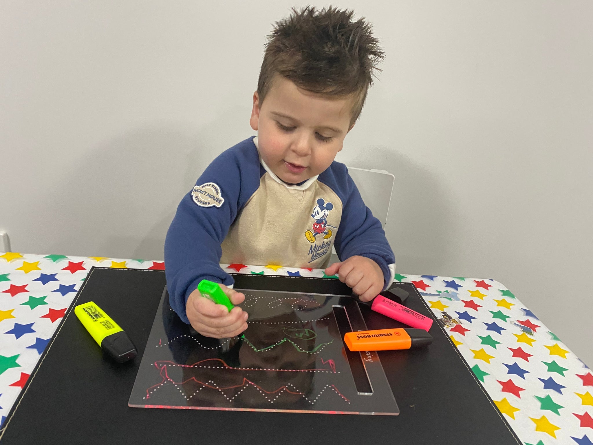You'll need either a pack of highlighters, chalk markers or white board markers and some baby wipes or tissues and your child is set to learn for the day. IT'S THAT EASY!!!