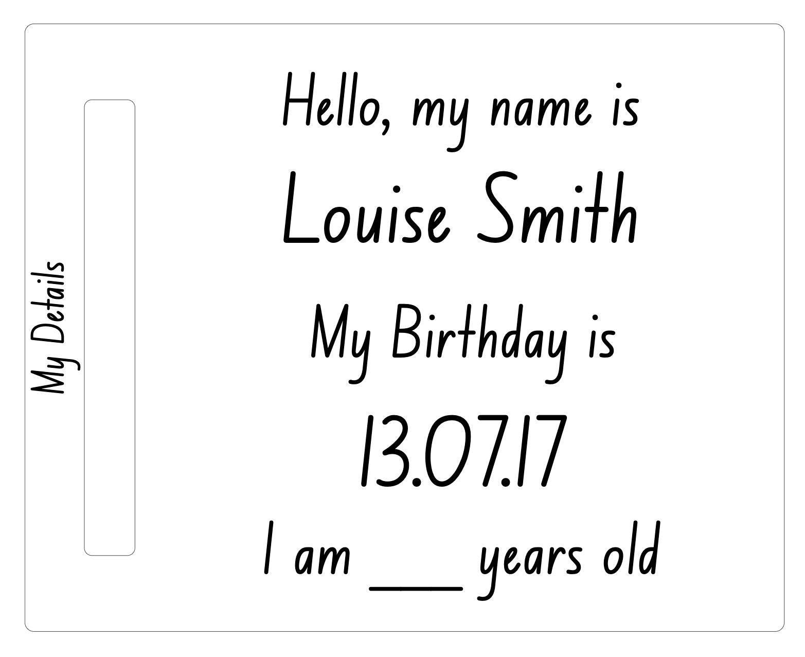 We encourage you to use bright coloured markers to make it fun and more appealing for children when they start tracing over the white lines. It will make teaching them their Name, Birthday and Age that much easier.